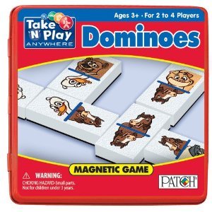 Take 'N' Play Anywhere games feature big magnetic playing pieces that are easy for kids to use and hard for kids to lose. The convenient 6 3/4" square tin case makes it easy to slip the games into most bags to take everywhere and keep kids entertained on a trip, waiting at the doctor's office, dining out, while stuck in traffic or just visiting grandma's house. With Dominoes you match up magnetic Dominoes on the game board for classic fun on the go.