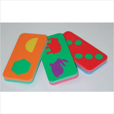 edushape 90506 - X This soft and colorful spin on dominos is perfect for youngsters! On the floor, on a table or even in the tub, these soft and safe Jumbo Dominos ensure hours of play anywhere. Whether you choose Animals, Shapes or classic Dots designs, these oversized game pieces are the perfect toy for little hands. Features: -Available in Animal, Shape or Dot sets -Two-toned foam dominos and designs in various Blue, Red, Green, Yellow and Purple combinations -Develop color, shape and number recognition -Wet and stick foam perfect for bath play Theme: Shapes