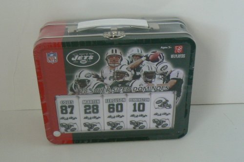 This is a New York Jets 28 Super-Sized Dominoes Collector's Edition Tin game. The Jets season never has to end with the New York Jets Domino Game! This collector's tin includes 28 super-sized dominoes with some of your favorite Jets players. Play traditional matching games, or just line'em up and knock'em down like the Jets try to do every Fall!