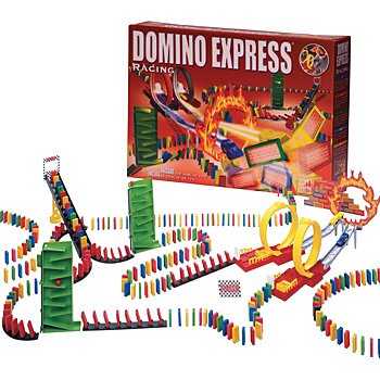 This domino racing pack has everything you need to turn knocking over dominos into an incredible event. Includes 100 dominoes and 50 specially crafted speed dominos that fall at lightening speed. In addition there are two loop de loops, two domino racecars, a ring of fire, custom domino tracks, and one tall launching bridge. Players can start together and race to see whose car goes through the ring of fire first.For ages 6 and up.